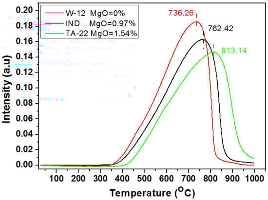 The temperature-programmed reduction (TPR) profiles for selected precursors are presented in Figure 3. Although only one peak occurs in each profile, the peak maxima vary. The lowest maximum of 736 °C is observed for the sample W-12, which was formed without a magnesium oxide addition. The higher the magnesium oxide concentration in the precursor, the higher the temperature of the TPR profile maximum. Based on the chemical composition of the catalysts, it can be concluded that the content of MgO significantly affects the course of the reduction process. From the slope of the curves, it can be concluded that the slowest reduction process was observed for the TA-22 catalyst with the highest concentration of magnesium oxide of about 1.5% wt. The TPR profiles are asymmetric for all precursor catalysts since different reduction steps overlap. The reduction degree of each precursor was calculated based on the hydrogen consumption during the TPR processes, and this is presented in Table 3. The reduction degree decreases with an increasing concentration of magnesium oxide in the precursors. This may be a result of the formation of new magnesium and iron phases or magnesium ions decreasing the kinetic parameters of the reduction reaction.