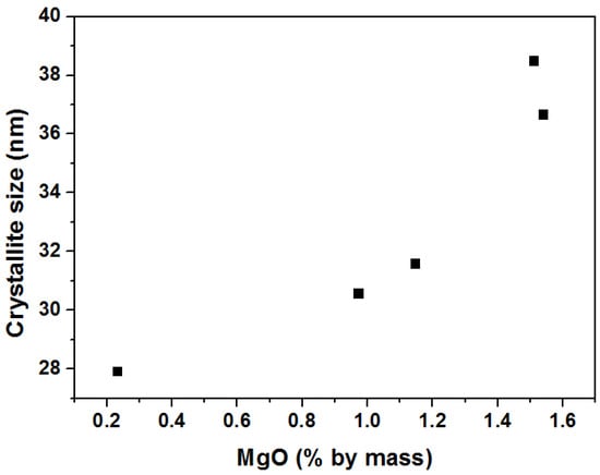 It was proven that oxides such as CaO, MgO, and ZrO2 can be applied as structural promoters in the wustite catalysts []. Calcium oxide easily builds into the wustite structure, which also has an impact on its uniform distribution in the reduced form of the catalyst. Due to their small radius, magnesium ions can be built into the structure of wustite [,]. Due to the high solubility in the wustite crystal, it should be considered a structural promotor that increases the resistance to sintering and increases the activity. It can be considered that MgO compensates for the role of Al2O3 as the structural promoter in a wustite-based catalyst. A low concentration of magnesium oxide significantly slows down the reduction of wustite []. However, these mechanisms are unknown. There is also no information on how the amount of MgO impacts the reduction process and activity in the ammonia synthesis reaction of the wustite catalyst.
