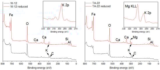 X-ray photoelectron survey spectra of samples W-12 (left panel) and TA-22 (right panel). The surface compositions before and after reduction in a hydrogen atmosphere are shown. The inserts in both panels represent blow-ups of the binding energy range taken from each survey spectrum after the reduction in hydrogen characteristic of the presence of potassium K 2p photoelectron peaks as well as magnesium Mg KLL Auger electron peaks.
