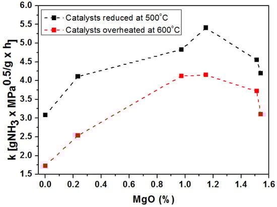 Figure 8 shows a correlation of the MgO concentrations in the precursors with the activity of the catalysts examined at 450 °C under 10 MPa. Two series of catalysts were examined: the data are presented as a black-point display activity for the catalysts reduced at 500 °C, while the red points represent the activity of the catalysts after a thermostability test. The reduction at 600 °C was used to simulate overheating of the catalysts in the reactor. The addition of magnesium oxide had a huge positive impact on the iron-based catalysts for the ammonia synthesis reaction. Each catalyst doped with magnesium had higher activity than the reference catalysts. The highest improvement in activity can be observed for the catalysts with an addition of magnesium oxide in the range from 0.9% to 1.2% by mass. For these catalysts, we can observe an increase in activity of over 47% compared to the reference catalyst. The further increase in the concentration of this promotor caused a decrease in the activity of the obtained catalysts. It is also important that the decrease in the activity of the catalysts after overheating is much smaller for the catalysts promoted with magnesium oxide than the catalysts without this addition. Magnesium oxide, in the wustite catalyst, takes on the role of a structural promoter. A decrease in the activity of the catalysts with MgO content above 1.2% by mass can be associated with a significant increase in the iron crystallites in these catalysts. The specific surface areas of the reduced catalysts at 500 °C were investigated with the method of single-point nitrogen adsorption at the liquid nitrogen temperature. The results varied in a range from 7.1 to 8.6 m2/g. The size of the specific surface of the catalyst is influenced not only by the MgO content but also by the content of other promoters in the catalyst grain. The content of these promoters in the catalyst grain depends on the R-value. Catalysts with various R-values were studied, so a direct relationship between the MgO content and the specific surface area is hard to find.