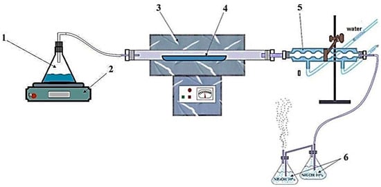 Figure 1. Laboratory setup for pyrohydrolysis. 1: flask with water; 2: electric stove; 3: oven LOIP LF/500–1200; 4: alundum boat; 5: refrigerator; 6: flasks with 10 wt% ammonia solution.