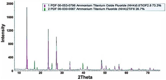 The studied sample consists of two phases, according to XRD analysis (Figure 2). The main share is (NH4)0.8TiOF2.8—73.3 rel. % and (NH4)2TiF6—26.7 rel. %.