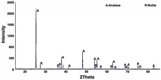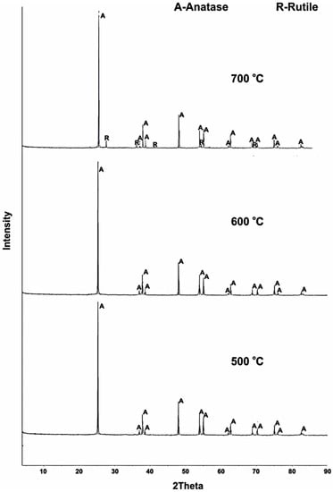 However, the structural modification of the resulting titanium dioxide was of interest. A series of experiments was conducted in the range of 400–700 °C in order to study the effect of the titanium fluoride pyrolysis temperature on titanium dioxide modification. The XRD analysis results show (Figure 4) that the pyrolysis of the initial product at 500–600 °C for 300 min resulted in the formation of an anatase monophase.