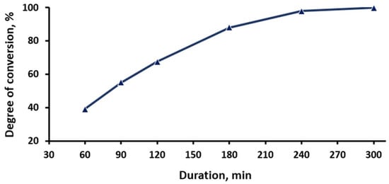 A series of experiments was conducted with duration of 60–300 min at 600 °C, with a steam supply rate of 1.5 dm3/g. The results of the experiments are shown in Figure 5.