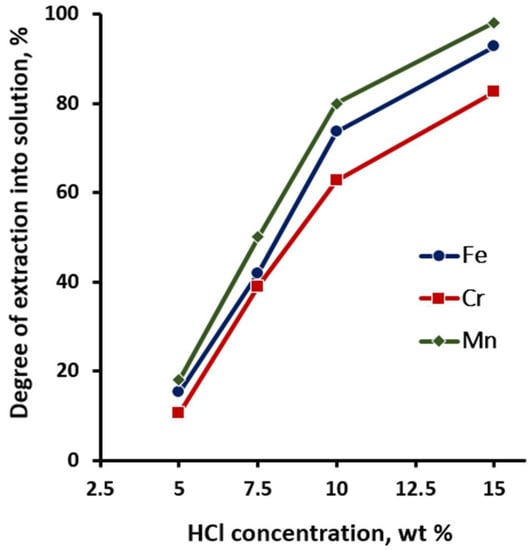 At the first stage, the effect of hydrochloric acid concentration was studied. Studies were carried out with hydrochloric acid solutions with concentrations of 5, 7.5, 10, and 15 wt% while maintaining the following constant conditions: temperature 30 °C, ratio S:L = 1:8, and duration 30 min. The results of studies of this series of experiments are presented in Figure 6.