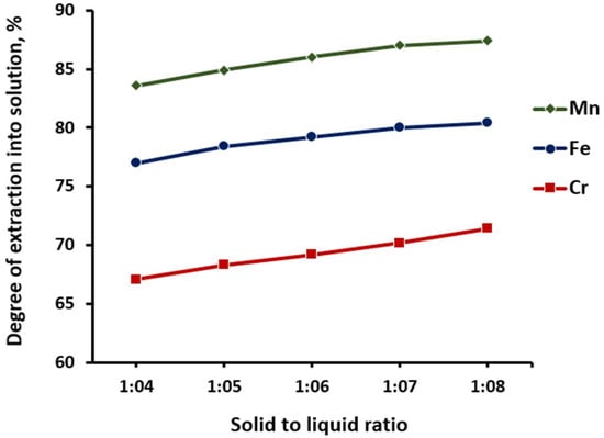 Figure 7. Dependence of the degree of extraction of manganese, iron, and chromium into the solution on the solid to liquid ratio.
