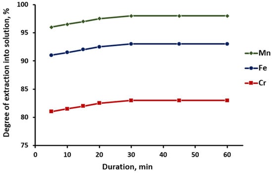 Figure 8. Effect of the duration of the leaching process of manganese, iron, and chromium on hydrochloric acid solution.