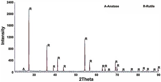 Table 2 shows that, in terms of the mass content of the main component, the resulting titanium dioxide could meet the requirements for obtaining pigment grades [43]; however, the content of impurities in the product was high and required additional processing.