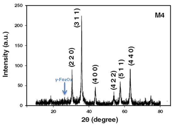 Samples of powdered magnetite nanoparticles were analyzed. Figure 3 shows the XRD magnetite of the M4 sample. Reflections are consistent with those reported in the JCPDS standard Magnetite No. 00-19-0629 [46,50]. The observed intensity index associated with each reflection is reported in Table 1. On the other hand, by calculating the lattice constant (a0), it turns to (311) and (400). The result of this calculation was a0 = 8.42 Å, which is among those reported for magnetite and maghemite (a0 = 8.351 and a0 = 8.399 Å). This fact may indicate that nanoparticles synthesized for this study show a crystal structure attributable to stoichiometric magnetite [51,52]. Two secondary peaks with low intensity were observed at 23.7 and 26.3 (2 degree angle, using copper radiation). These peaks correspond to the characteristic maghemite species. Therefore, the dark brown powder obtained under the established conditions for this study showed the presence of maghemite, which corroborates the observed X-ray diffraction data [53].