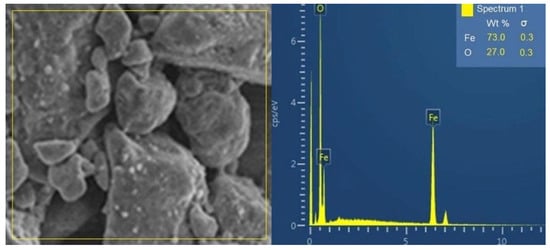 EDS spectra of the magnetite, where the presence of the oxygen and iron elements that constitute the sample were determined in percentages.