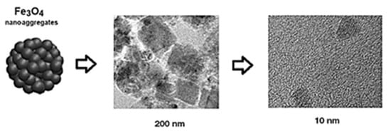 Figure 7 shows the scheme of nano-aggregates of Fe3O4 nanoparticles from 200 nm to 10 nm. These aggregates are a product of the magnetization of the nanoparticles.