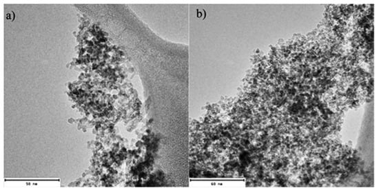 In Figure 6, it can be seen that the magnetite nanoparticles tend to agglomerate. The presence of particles with a size distribution between approximately 7 and 12 nm, which are quasi-rounded and highly crystalline nanoparticles, can be appreciated in all these samples. From their hexagonal morphology observed in Figure 6b,d,f, it can be confirmed that magnetite nanoparticles were successfully synthesized.