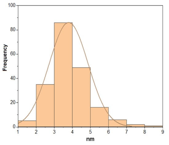 In the HREM images, magnetite particles at a nanometer scale are observed with a size less than 10 nm, so a graph of the diameter distribution of the nanoparticles was made with Origin and using the software ImageJ to realize the measurement of the nanoparticles (see Figure 9) [56,57]. Figure 9 shows a particle size distribution that fits a normal-type curve (orange line) with a mean diameter of 3.79 nanometers and a standard deviation of 1.07. This information matches the Scherrer equation data obtained from the M1 sample.
