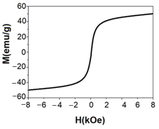 Figure 11 shows the cycle of hysteresis of the magnetite nanoparticles. It is observed that the material has a typical superparamagnetic behavior. That is, it has zero coercivity. The saturation magnetization for the magnetite was 50 emu/g. The result shows that the magnetization value (Ms) is smaller than the bulk magnetite-Fe3O4 (93 emu/g). Three main reasons have been proposed to explain lower Ms of nanoparticles than that of their bulk state: (i) the presence of a non-magnetic layer on the NP´s surface (a dead magnetic layer), (ii) cations’ distribution, and (iii) surface spin disorder. The oxygen presence can lead to information about the other phases (e.g., maghemite) besides magnetite. However, the magnetite and maghemite phases have similar physical and structural properties. These conditions make it difficult to distinguish by the XRD analysis. Note that the magnetite phase is stronger than the maghemite phase in terms of magnetic properties, according to the literature. Furthermore, the transformation from bulk to nanostructure state (which is accompanied by the increase in surface/volume ratio and decrease in Ms) occurs by the intrinsic factor. Meanwhile, the oxidation factor depends on the synthesis conditions (e.g., the atmosphere type), which are relatively controllable [19,58,59,60,61,62,63,64].