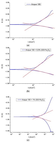 (a). Polarization curve for (Acqua 100) with corresponding settings. (b). Polarization curve for (Acqua 100 + 0.5% NPs) with corresponding settings. (c). Polarization curve for (Acqua 100 + 1% NPs) with corresponding settings.