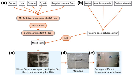 The NAAC was prepared in the following sequence (as shown in Figure 2): Cement, lime, gypsum, fly ash and recycled concrete fines were added into the mixer and mixed at low speeds (48 ± 3 rpm) for 1 min. Then, 50% of the water required for mixing was introduced into the mixture of dry ingredients and mixed for 1.5–2 min to obtain a well-mixed slurry. After that, aluminum powder and sodium stearate were mixed in the remaining mixing water, and then the prepared aqueous solution was added into the resulting mixture slurry; mixing continued for 0 s. After resting for 1 min, the slurry was continually mixed at low speeds for 2 min until a homogeneous mixture without agglomerates was obtained.