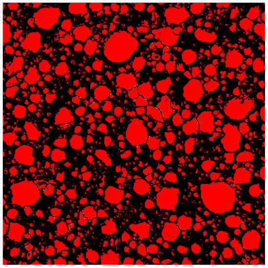 The image-processing software and pore structure characterization software used in this study was Image-Pro Plus [44]. First, the cross sections of NAAC specimens after pretreatment were photographed and cropped using a digital microscope. The maximum resolution of the obtained RGB images was 640 × 480 using 50× magnification. Then, the Image-Pro Plus software was used for image binarization and pore segmentation to obtain the image shown in Figure 3. The red part represents pore spaces, and the black part represents pore walls.