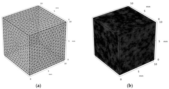 The meshing method with physical field controls in COMSOL was used, and the grid’s independence test was carried out. It was determined that the simulation results of the thermal conductivity of NAAC are less sensitive to grid fineness. Based on the consideration of the simulation accuracy of small size pores and calculation time, the meshing parameters of reference concrete were set as follows: the maximum unit size of reference concrete was 1 mm, the minimum unit size was 0.18 mm, the maximum unit growth rate was 1.5, the curvature factor was 0.6, and the narrow area resolution was 0.5. The meshing parameters of NAAC were set as follows: The maximum unit size of reference concrete was 0.8 mm, the minimum unit size was 0.1 mm, the maximum unit growth rate was 1.45, the curvature factor was 0.5, and the narrow area resolution was 0.6. The meshing results of the reference concrete and NAAC are shown in Figure 6.