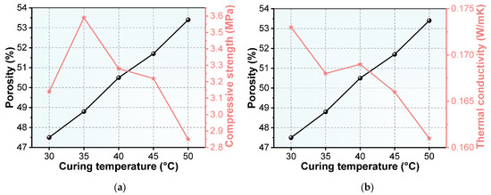 (a) Porosity and thermal conductivity of NAAC at different curing temperatures; (b) porosity and compressive strength of NAAC at different curing temperatures.