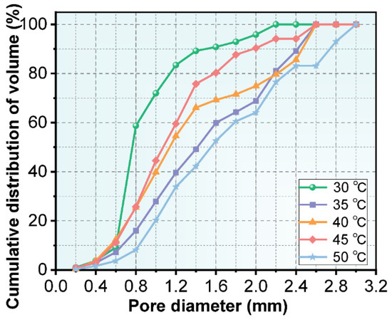 Cumulative frequency distribution of the pore volume at different curing temperatures.