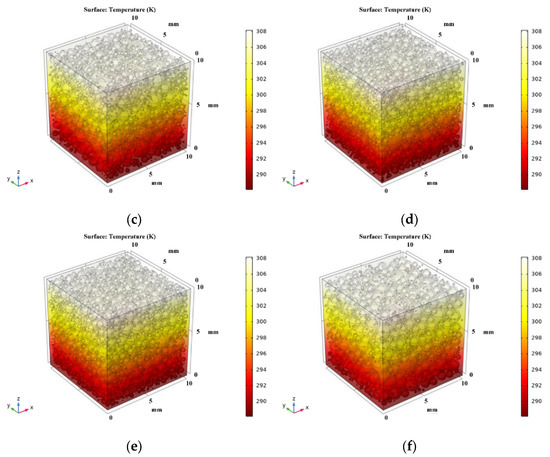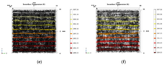 Based on the porosity and pore size distribution obtained from the pore structure’s analysis, the model of the NAAC’s pore structure was reconstructed by COMSOL. Moreover, the three-dimensional temperature distribution of NAAC specimens at different curing temperatures was obtained using COMSOL steady-state simulations, as shown in Figure 10. It can be seen that the temperature distribution of NAAC specimens obtained under different curing temperatures is similar to that of the reference concrete, and the NAAC with different porosities all reach the temperature equilibrium in the middle of the test blocks. Figure 11 shows the three-dimensional isotherm of the NAAC test blocks. It can be seen from Figure 11a that the isotherm of the reference concrete specimen (porosity is approximately 0) is straight and uniformly distributed, which indicates that heat is evenly diffused in the concrete test block. It is worth noting that with the increase in curing temperatures (porosity increases), the isotherms between the continuous medium and the dispersed medium are significantly distorted (as shown in Figure 11b–f). This is mainly due to the increase in porosity and the appearance of large pore sizes as the curing temperature increases. The change in the pore’s structure will lead to an inhomogeneous interface and changes in the heat transfer path. Additionally, the thermal conductivity of air is much lower than that of concrete, and there will be a thermal bridge effect at the edges of the pore’s structure.