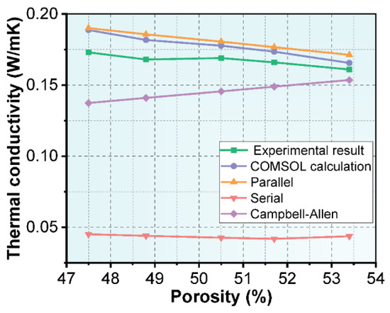 The series model, the parallel model and the Campbell-Allen model derived from Ohm’s law based on the series and parallel model are the classic models for thermal conductivity calculations. The thermal conductivity of NAAC with different porosities calculated by COMSOL was compared with the predicted results of the classical models, and the results are shown in Figure 12. Table 6 further shows the relative errors between the predicted thermal conductivity of the four models and the experimental test results. It can be seen that the thermal conductivity predicted by COMSOL is in the best agreement with the experimental test results, and the errors under the five types of porosity are 9.09%, 8.18%, 5.17%, 4.53% and 2.84%. A distinct phenomenon worth noticing is that the prediction accuracy of COMSOL increases with the increase in NAAC’s porosity. This result indicates that the COMSOL finite element software has a better adaptability to the dense and complex pore structure of NAAC. The high accuracy of COMSOL in predicting the thermal conductivity of NAAC can be attributed to the fact that the model was established based on the information on porosity and pore size distribution obtained by the image method, and the basic parameters such as material density and specific heat capacity were fully considered [46,47]. Simultaneously, the COMSOL finite element software can well describe the distribution of the internal pore structure of NAAC and effectively mesh so as to obtain the quantitative results of the thermal conductivity. In addition to the COMSOL simulation, the parallel model also shows good predictions. The reason is that the porosity of NAAC is large and the pore size distribution is relatively concentrated, so its internal pore structure is closer to the geometric model of the parallel model than that of the series model and the Campbell-Allen model. The above results show that COMSOL simulations can be used as effective methods for predicting the thermal conductivity of NAAC, and its calculation accuracy is higher than that of simple two-phase models, such as parallel models, series models and the Campbell-Allen model. Moreover, the COMSOL simulation shows better prediction results on the thermal conductivity of NAAC with high porosity.