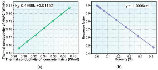 (a) Effect of concrete matrix thermal conductivity on the thermal conductivity of NAAC; (b) response coefficient of the NAAC thermal conductivity with different porosities to the concrete matrix’s thermal conductivity.