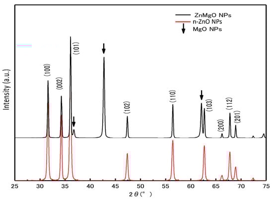 Figure 2 shows the X-ray diffraction (XRD) patterns of the ZnMgO NPs and n-ZnO NP powder samples. The diffraction peaks of n-ZnO NPs and ZnMgO NPs had a hexagonal wurtzite structure, which agrees with ZnO’s standard JCPDS (card no. 36-1451). The additional peaks corresponded to the formation of MgO (No-7-239) [31] compounds from the presence of remaining MgO NPs after annealing. The shift of XRD peaks in ZnMgO NPs occurred toward the lower angle. The lattice constant of ZnMgO NPs was different from the n-ZnO NPs due to the inclusion of the foreign impurity (Mg+2) imposed in the host ZnO lattice. This attribution was due to the difference in ionic radius, where the ionic radius of Mg is 0.57 Å, and that of Zn is 0.60 Å [31,32,33]. The lattice constant of the prepared ZnO NPs was 3.259 Å for the a-value and 5.2207 Å for the c-value. On the other hand, the lattice constant of ZnMgO NPs was 3.270 Å for the a-value and 5.2361 Å for the c-value. The ratios of the c/a lattice parameters were 1.6019 for the prepared n-ZnO NPs and 1.6012 for the ZnMgO NPs. The bandgap of the semiconductor was affected by the reduction ratio of the c/a lattice parameters [34]. Vegard’s law expresses a proportional relationship between the lattice constant of the alloy and the concentration of composite elements [35]. For the Zn1−xMgxO NP composite, the equation is