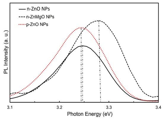 Figure 3 shows a comparison of the PL spectra results for the n-ZnO NPs (black solid line), n-ZnMgO NPs (black dotted line) and p-ZnO NPs (red dotted line). The PL emission peak of p-ZnO NPs shifted toward the lower-energy side due to the nitrogen acceptor incorporated into ZnO NPs and the appearance its of donor–acceptor pair (DAP) transition [17]. The observed peak position of the band edge luminescence for ZnMgO NPs was at about 3.278 eV and that of n-ZnO NPs was at around 3.246 eV. The emission peak of the PL of the ZnMgO NPs shifted more toward the higher-energy side than the peak energy of the n-ZnO NPs. The difference in PL peak energy between the n-ZnO NPs and ZnMgO NPs was 32 meV. As we know, the bandgap energy of ZnO is 3.37 eV. In this case, assuming that the exciton binding energy does not change with the addition of Mg, the bandgap of ZnMgO NPs can be estimated to be 3.40 eV. The content (x) of Mg can be calculated from Equation (2) [35].