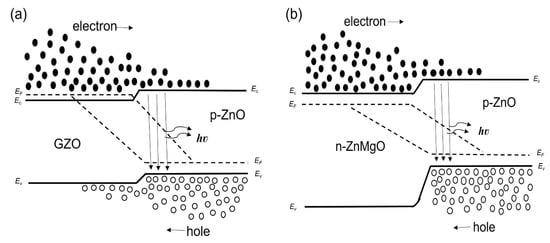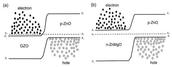 Band diagrams under forward bias conditions (band bending is not taken into account) (a) p-ZnO/GZO homojunction; (b) p-ZnO/n-ZnMgO heterojunction.