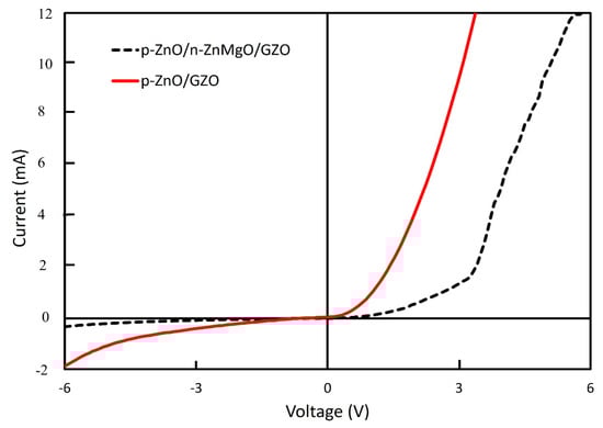 I–V characterization of ZnO NP-based LEDs with the structure of p-ZnO/n-ZnMgO/GZO and p-ZnO/GZO.