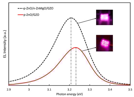 The EL spectra of the LEDs with p-ZnO/n-ZnMgO/GZO and p-ZnO/GZO structures at room temperature are presented in Figure 7. By inserting the ZnMgO NP energy-barrier layer, the intensity of the EL spectra increased compared to that without the ZnMgO NP layer. In the p-ZnO/GZO structure, holes are injected into the n-type GZO layer. However, the holes injected into the GZO layer do not contribute to luminescence because GZO has a high electron concentration and does not emit light. The p-ZnO layer has a lower hole concentration than the electron concentration in the GZO. The LED with p-ZnO/GZO structure shows a charge imbalance, which means that more electrons are congregated in the p-ZnO layer with holes. The configuration with an inserted ZnMgO layer (p-ZnO/n-ZnMgO/GZO) is a structure that balances the concentration of electrons and holes. The reason for this was that the energy barrier layer blocked the injection of the holes into the n-type layer and increased the concentration of holes in the active region, as shown in Figure 5. As a result, more holes contributed to luminescence in the LED with p-ZnO/n-ZnMgO/GZO structure and enhanced the emission compared to the LED with p-ZnO/GZO structure.