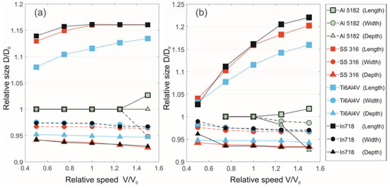 Dependence of the relative melt pool size with a change in the scanning speed (the unit is taken as the speed V0): (a) at constant power, (b) at constant linear energy.