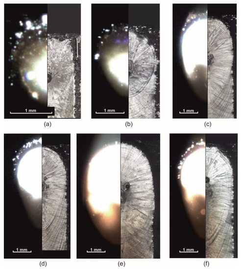 A series of melt pool images for various mode parameters taken using a coaxial camera (left) and the result of crystallization (right). Mode parameters: (a) 800 W, 20 mm/s; (b) 1000 W, 20 mm/s; (c) 2000 W, 20 mm/s; (d) 2000 W, 30 mm/s; (e) 2500 W, 10 mm/s and (f) 2500 W, 30 mm/s.