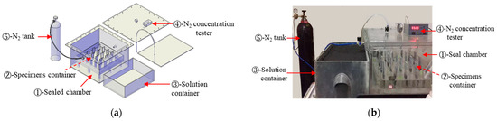 The experimental setup mainly consisted of a sealed environment box, a specimen immersion box, a solution box, a nitrogen concentration tester, and a liquid nitrogen tank, as shown in Figure 1. The specimen box with a height of 40 mm contains a 5% Na2SO4 solution. When the specimens were partially immersed in this box, the nitrogen gas was provided as protective gas in sealed chamber. The humidity in the sealed environment box was controlled within 65 ± 5% using saturated MgCl2 solution in the solution box.