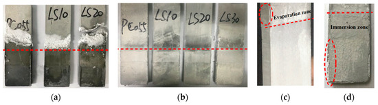 Figure 3a shows pictures of specimens after 80 days of exposure to 5% Na2SO4 solution in air. The surface of the evaporation zone of all specimens was covered with considerable whitish crystals. The formation of whitish crystals on the evaporation zone surface is a clear indicator for salt crystallization. The addition of limestone the LS20 specimen fractured in the evaporation zone (after 50 days of partial immersion, the LS30 specimen had already fractured in the evaporation zone). The evaporation zone of all specimens had different degrees of deterioration. The degree of damage in the evaporation zone was more serious in all specimens than in the immersion zone.
