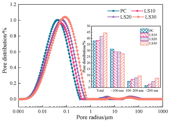 The pores provided volumes for expansive crystals growth during sulfate attack and channels for ions diffusion, and therefore pore structure is important target for analysis on damage from sulfate attack. Here, the pore size distributions of the specimens before sulfate attack are shown in Figure 4. The pore sizes are classified into three ranges: <100 nm, 100–200 nm, and >200 nm.