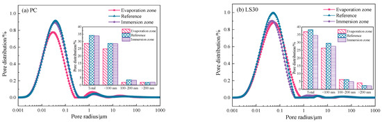 Pore size distribution in evaporation zone, immersion zone, and reference of partially immersed for 80 days specimens.