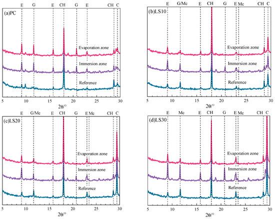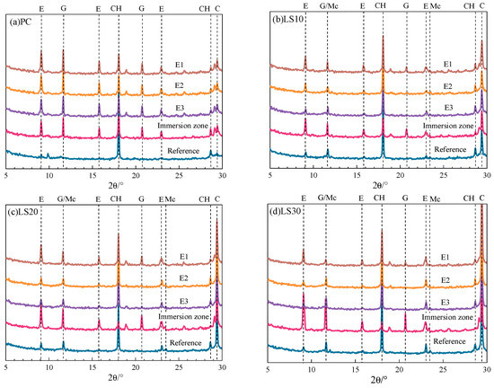 In contrast, for LS specimens, diffraction peaks of ettringite and gypsum become more intensive in the immersion zone rather than in the evaporation zone (Figure 7b–d). The quantitative analysis of ettringite and gypsum were carried out and the results are shown in Figure 8.