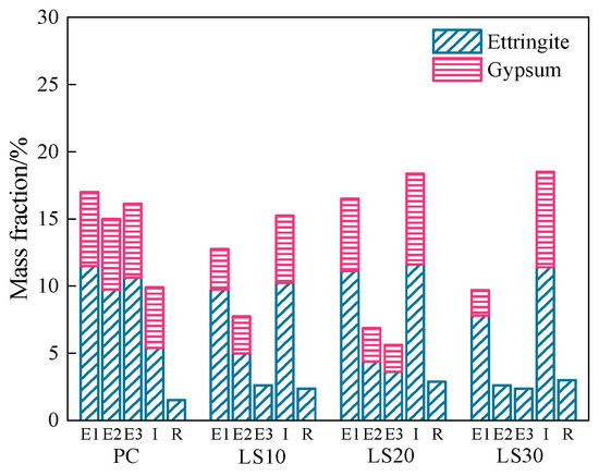 Clearly, the content of ettringite in the immersion zone of LS30 reached 11.4 wt. % while in the outer layer (E1) and the inner layer (E3) of the evaporation zone, it was only 7.8 wt. % and 2.4 wt. %. In the E2 and E3 layer, the content of gypsum is too low to be detected. While the weakening of capillary adsorption reduces the concentration of sulfate ions in the evaporation zone, slowing down the degree of erosion, under the influence of water evaporation, the E1 sulfate concentration in the evaporation zone of the samples is higher than the E2 and E3 [27], so that more chemical products are produced. The results illustrate that the immersion zone of LS30 samples was more severely attacked by the sulfate ions than the evaporation zone. Consequently, damage on LS samples was found at the immersion zone instead of evaporation zone. The contents of ettringite and gypsum in the immersion zone decreased when less limestone was incorporated. The content of these expansive products reached 12.9% (LS10), 15.5% (LS20), and 15.7% (LS30), respectively. This explains why LS30 and LS20 specimens were more severely damaged than LS10 (undamaged). The reason behind may be that increase in the limestone addition leads to the larger porosity that favors sulfate ions diffusion [15], as discussed above.