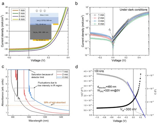 - Spalatu, N.; Krautmann, R.; Katerski, A.; Karber, E.; Josepson, R.; Hiie, J.; Acik, I.O.; Krunks, M. Screening and optimization of processing temperature for Sb2Se3 thin film growth protocol: Interrelation between grain structure, interface intermixing and solar cell performance. Sol. Energy Mater. Sol. Cells 2021, 225, 111045. [Google Scholar] [CrossRef]