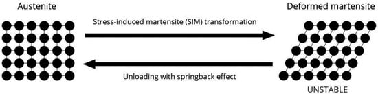 Demonstration of superelasticity (SE) through stress-induced martensite transformation (SIM) within 8% elastic deformation. The martensite is in an unstable monoclinic lattice structure and returns to its austenitic state upon the unloading of stress.