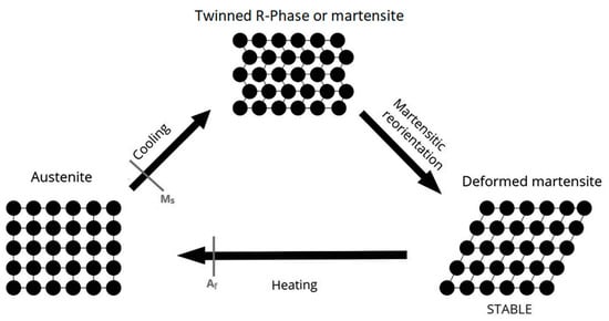 Demonstration of shape memory effect (SME). Austenite (above the austenite finish temperature, Af) is cooled to a twinned martensitic phase (from the martensitic start temperature, Ms) known as R-phase. As NiTi in the R-phase cannot be ground, it is instead twisted and reoriented into a stable martensitic phase and is heated and cooled back into the austenite crystalline structure [6].