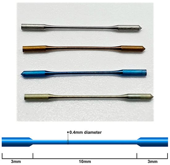 Four different types of NiTi wire specimens were sourced from Dentsply Maillefer (Ballaigues, Switzerland). All samples were manufactured to a 0.4 mm cross-sectional diameter and a total length of 16 mm, of which the central 10 mm portion was sized to the relevant gauge; samples for three groups had then been subjected to typical post-manufacture heat treatment. The shape and dimensions of the wires were based on materials described in a previous study [9]. The wire type and the corresponding proprietary endodontic instrument brands are detailed in Table 1, while the dimensions are detailed in Figure 3. The ends of the wire samples had been milled to a larger diameter to facilitate the grip mechanism for the uniaxial test machine. Of note, “Superflex” is an undisclosed proprietary NiTi type that has been used in the fabrication of the TruNatomyTM (Dentsply Sirona, Charlotte, NC, USA) instrument.