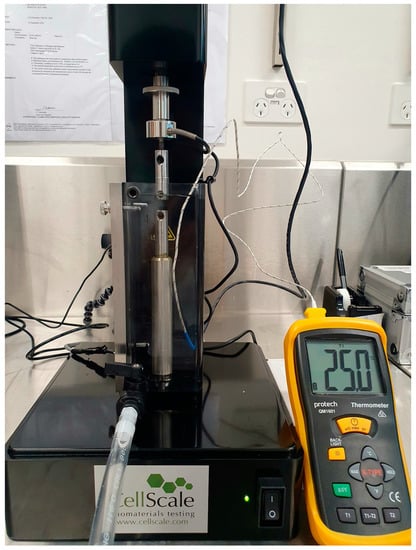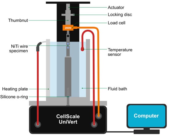 Two custom-made stainless steel grips were used in a microtensile test rig (UniVert, CellScale, Waterloo, ON, Canada) to attach the wire specimens. Stainless steel tubes were milled to fit the actuator and base components of the UniVert machine and aligned rigidly in the same axis of the actuator. The tester was fitted with a water bath, a heating plate and a temperature sensor to provide a pre-selected ambient temperature (Figure 4 and Figure 5). An externally placed thermocouple with an accuracy of ±0.1 °C was used to monitor the temperature of the water bath and to ensure that this was maintained at ±1.0 °C.