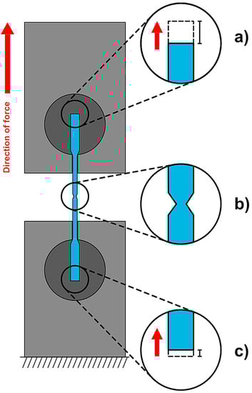 A digital image correlation (DIC) technique was used to obtain strain measurements. Images were captured using a high-resolution webcam (Logitech HD Pro Webcam C920, Logitech, Lausanne, Switzerland) at a rate of 1 Hz, which corresponded to output data from the UniVert (Figure 6). The extensions until ultimate tensile failure were analyzed using ImageJ software using the difference in pixels, converted to measurements in millimeters (mm) by calibration of images using fixed landmarks with known dimensions in the images. Using the formula in Equation (2), strain values were calculated.