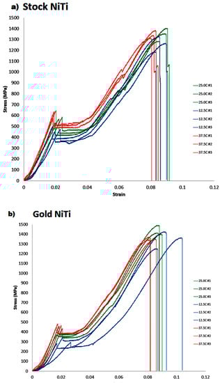 Microtensile test results were consistent within each sample group (Table 2). In general, Ea and σA-M values increased with temperature for all four groups of NiTi wire samples, while Em, εmax and σmax did not appear to be affected by temperature changes (Table 3). At 37.5 °C, all four NiTi types were significantly different from each other for all mechanical properties, but at 12.5 °C only Ea and σA-M were significantly different. At 25 °C only εmax, σA-M and σmax were significantly different (Table 4). The stress–strain graphs of all conducted experimental runs are shown in Figure 7.