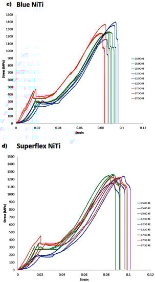 Stress–strain graphs of Stock (a), Gold (b), Blue (c) and Superflex (d) NiTi conducted across 12.5 °C, 25.0 °C, and 37.5 °C.