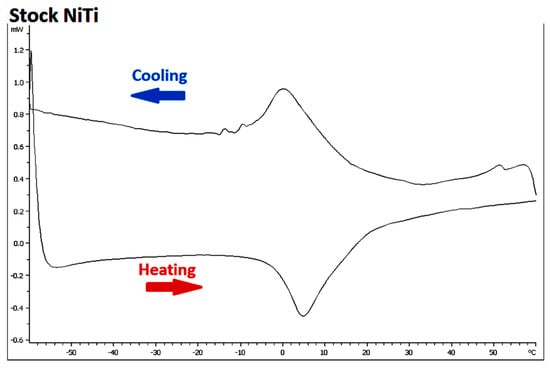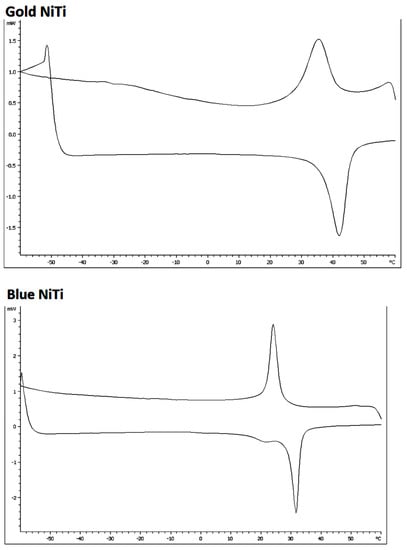 The DSC results of the present study are comparable to those reported in prior investigations for Stock [11,12,16,17], Gold [18,19] and Blue [11,16,20,21] NiTi alloys. The Stock NiTi alloy samples behave overall differently compared to the three heat-treated NiTi samples examined, with considerably lower transition temperatures for both the austenitic and martensitic phases. During the heating phase of Blue NiTi alloy, a small initial peak occurred, suggesting a transformation of from a martensitic to a rhombohedral intermediate “R-phase”, with a second more pronounced peak for the R-phase to austenite transformation [21]. The transition of martensite to R-phase to austenite is similar to that observed in the Superflex NiTi alloy, which performs similarly to Blue NiTi. The smaller peaks noted in the Stock NiTi alloy in the cooling phase are likely due to impurities in the reference pan, which is a well-documented source of error in DSC experiments [22,23]. Testing the samples with a larger temperature range (e.g., from −100 °C to +100 °C) could also confirm whether there were more transformation peaks in those temperature ranges. Future studies could use X-ray powder diffraction (XRD) to explore further the phases of NiTi present, particularly for Superflex NiTi.