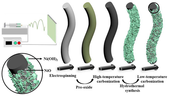 Among a large number of electrode materials, Ni(OH)2 has a high theoretical specific capacitance and layered structure, while NiO has a higher specific capacitance, low price and easy synthesis [9]. Therefore, Ni(OH)2 and NiO have received more and more attention and are often used as electrodes in asymmetric supercapacitors due to their excellent electrochemical properties [10]. However, due to their poor crystallinity, electrical conductivity and redox reversibility, their real capacitance values in practical applications are far lower than the ideal values [11]. An effective way to cope with this problem is to prepare them into nanostructured materials, such as nanoflowers [12] and nanosheets [13], which can effectively increase the specific capacitance of the material. Another approach is to combine Ni(OH)2 and NiO or compound them with other materials into composite materials, which can effectively improve the performance of a single material. For example, Dai et al. prepared Ni(OH)2/NiO/Ni composite nanotube array films by electrodeposition, which showed that the multi-layered composites had high specific capacitance, excellent multiplicative properties and excellent electrochemical cycling stability [14]. Gunasekaran et al. fabricated NiO@Ni(OH)2-α-MoO3 heterostructured nanocomposites with high specific capacitance, long cycle stability, excellent reversibility and high energy/power density by hydrothermal process [15]. In addition, the composites of Ni(OH)2 or NiO with carbon-based materials can enhance their electronic conductivity, increase their specific surface areas and improve their capacitive properties [16], which are excellent candidates for supercapacitor electrode materials. Electrospinning technology is a simple and effective method to fabricate nanofibers [17], and the carbon nanofibers (CNFs) derived from the carbonization of nanofibers have excellent electrical conductivity and good mechanical stability, which are often used as carbon-based electrode materials for supercapacitors [18]. However, Ni(OH)2 and NiO co-grown on CNFs have rarely been reported.